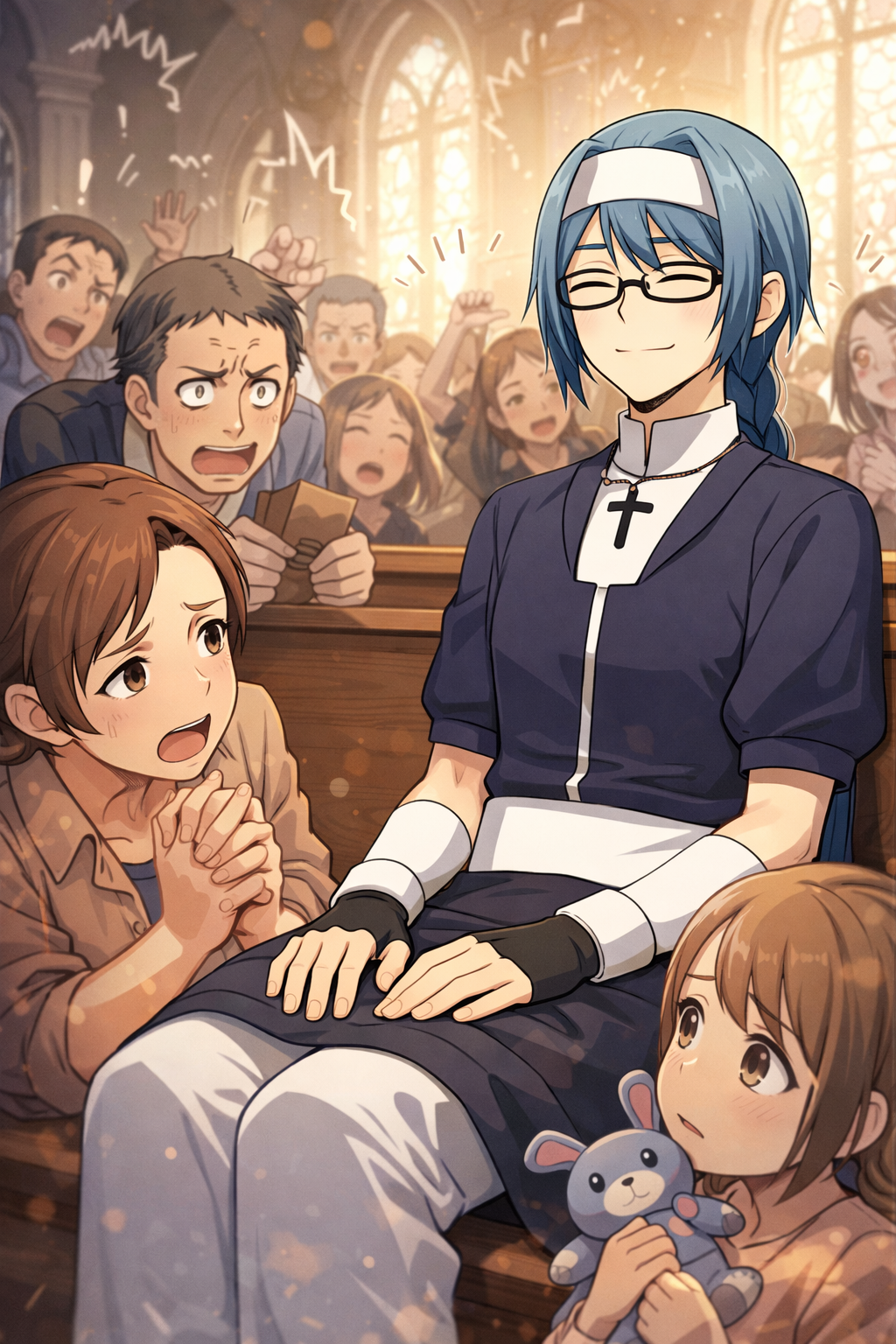 教会の長椅子。昼下がりの光が差し込む中、メルクリウスは静かに座っている。
