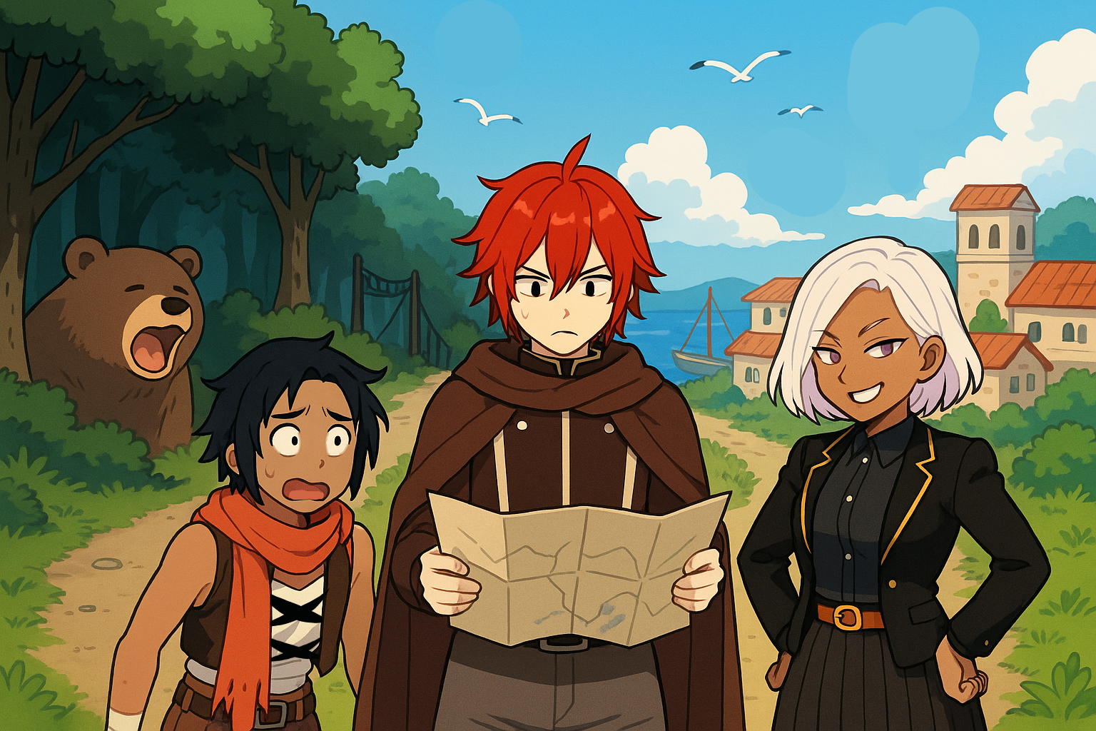 砂利道に立ち止まった三人の若者が、使い古した地図を広げている。