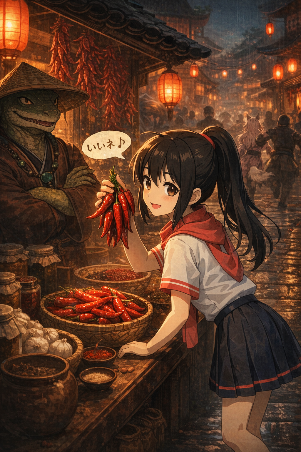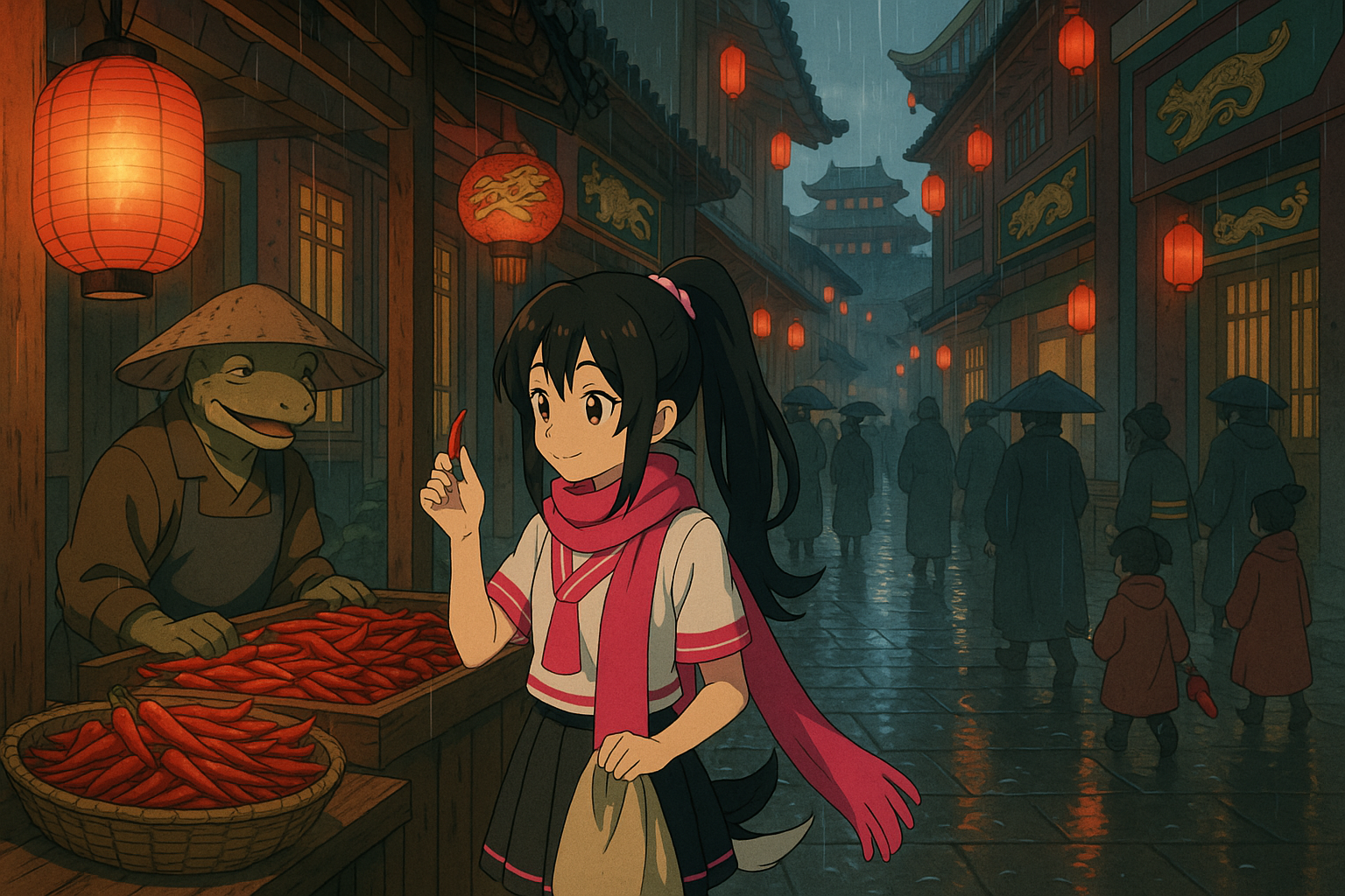赤提灯の下、唐辛子の山を眺めていたハオが、ふとひときわ鮮やかな一本を手に取る。