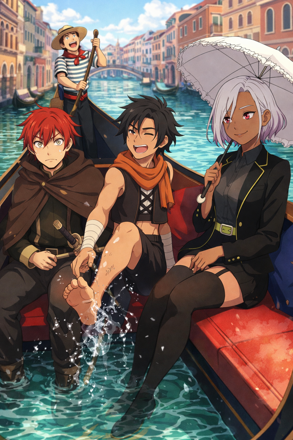 赤と白の縞シャツの船頭たちがゴンドラを操りながら笑い声を交わす。