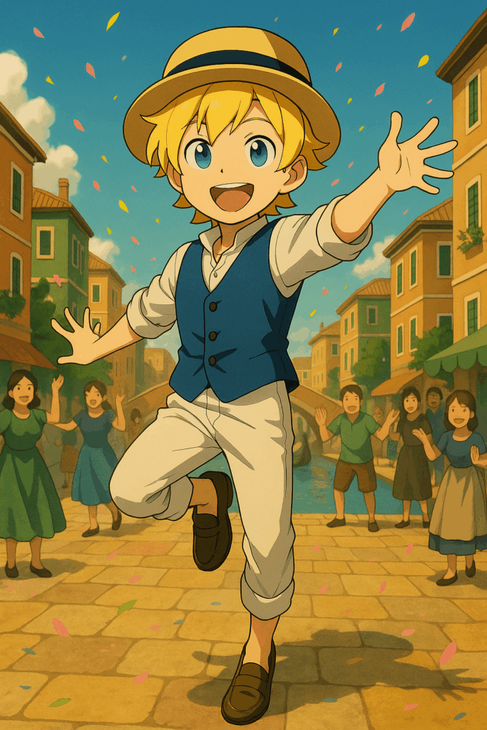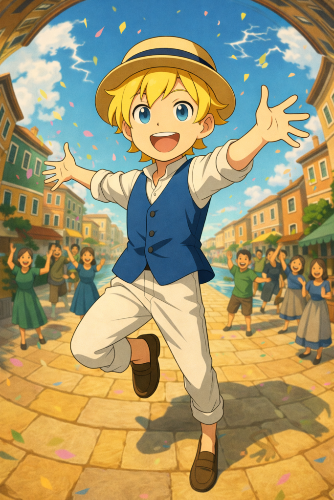 金髪の少年――ヴァレンは、青いベストの裾をひらりと揺らし、軽やかに回転してみせた。