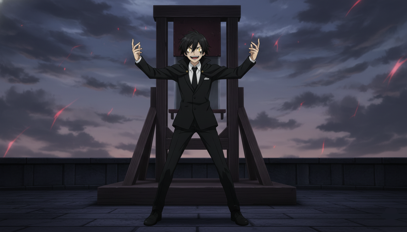 スーツに身を包み、ギロチン台の前で異様に楽しげに笑う青年。