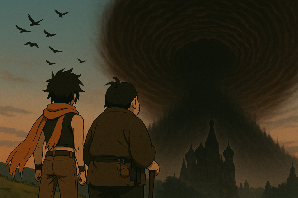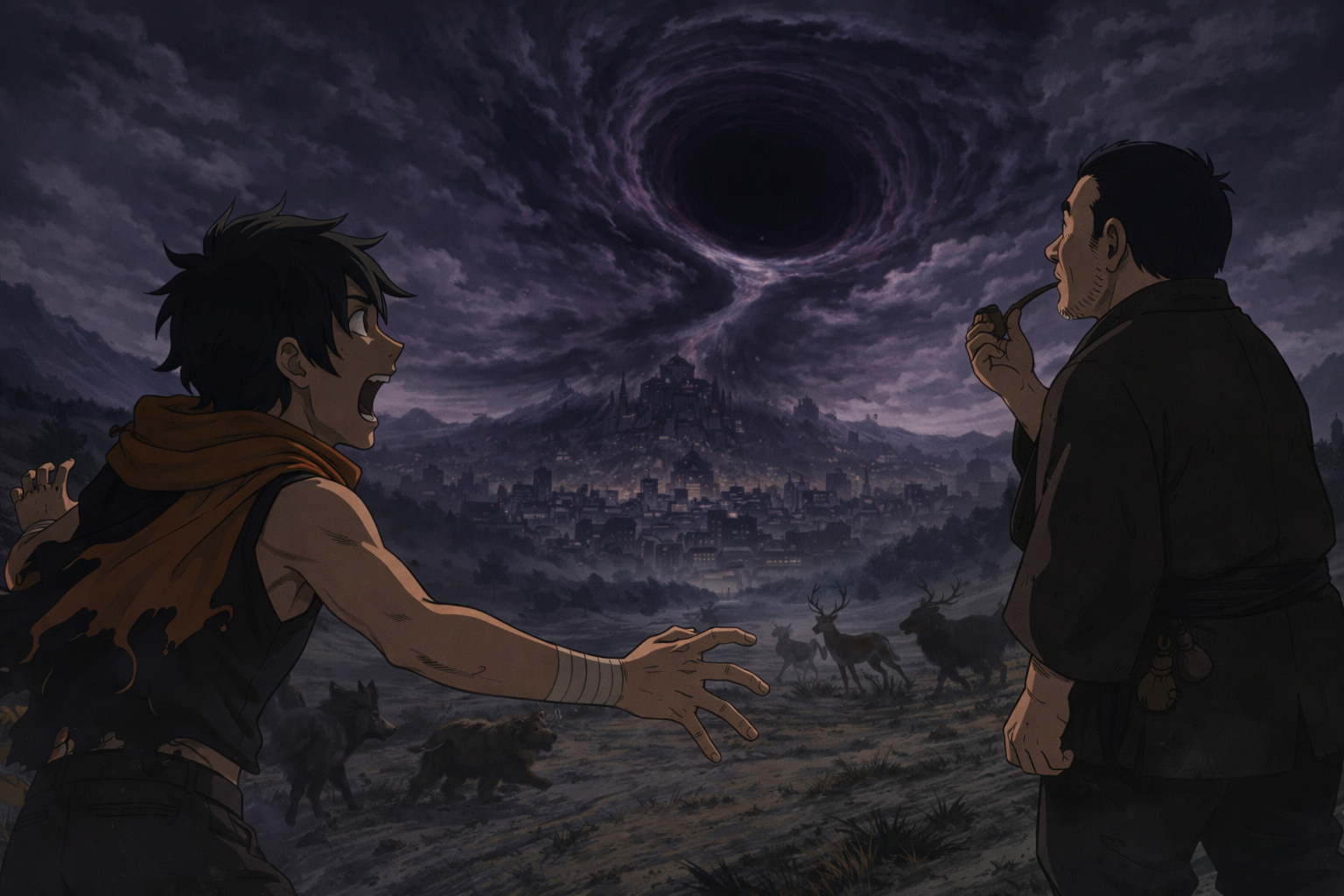 鳥の群れが渦の端をかすめ、帝都は「死」と「再生」の只中に沈んでいた。