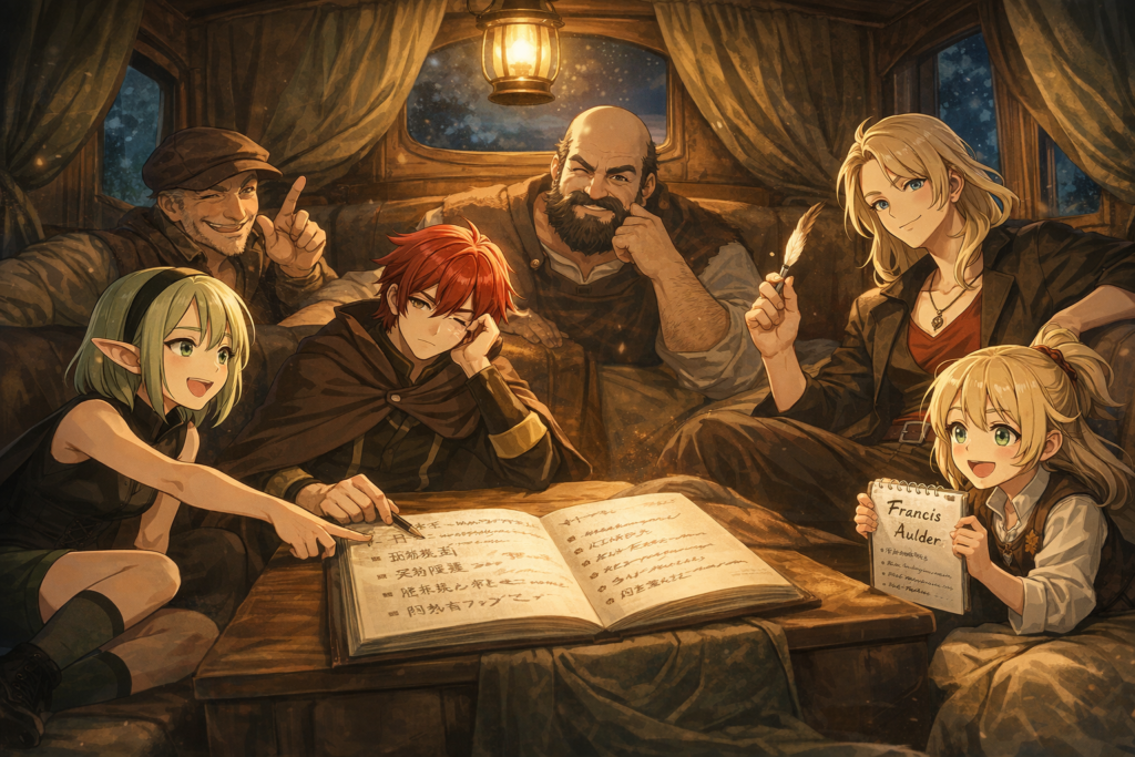 馬車の揺れが落ち着き、ランタンの灯が穏やかに揺れている。