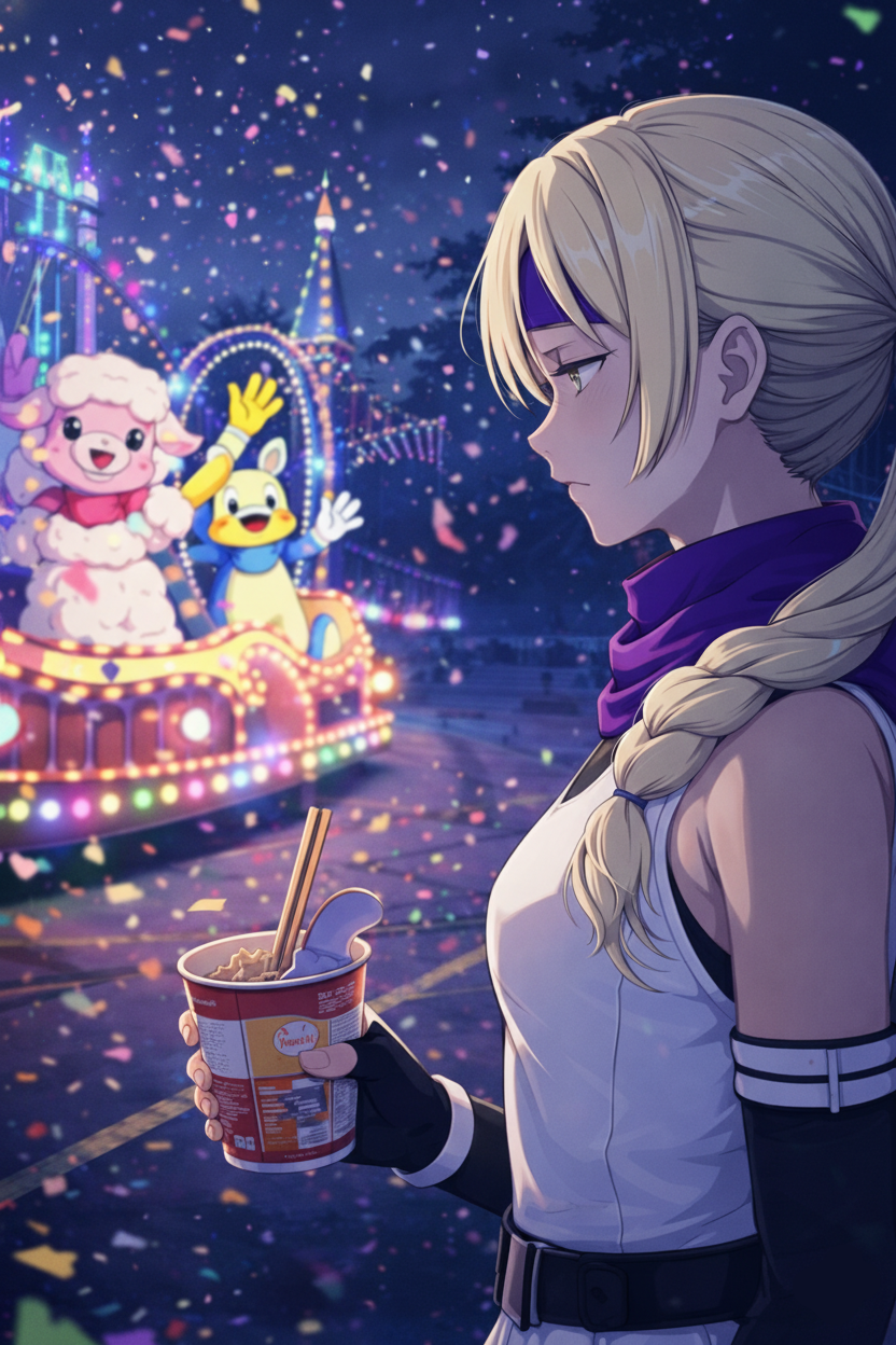 ティアはカップ麺片手に祝祭の中で立ち止まる。