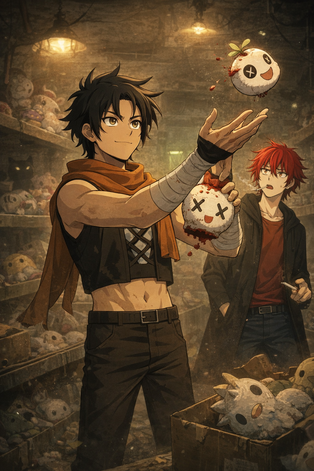 サタヌスは腕組み、真顔で“没ぬい”の箱をガサガサ物色。