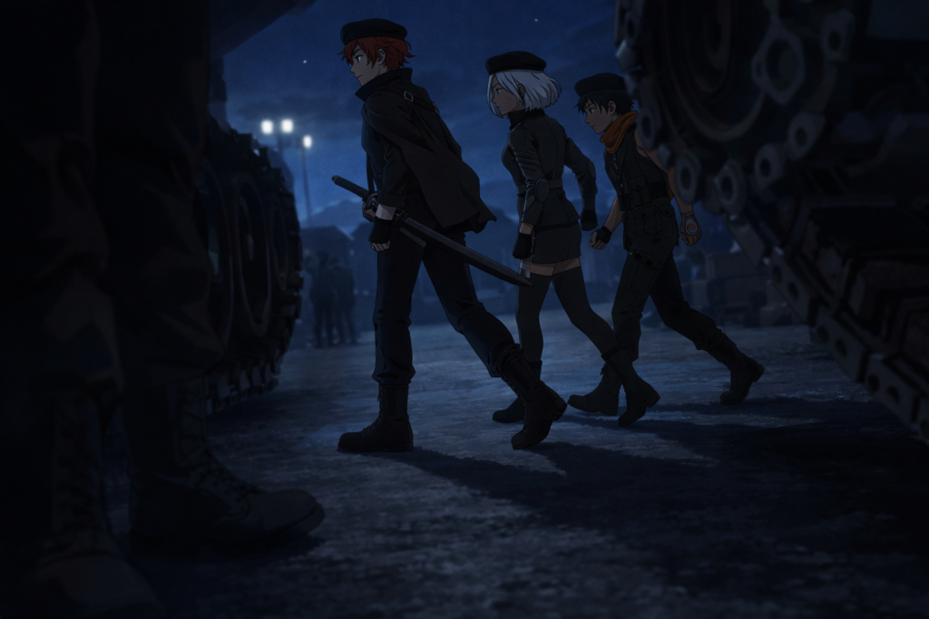 そこから、四人の兵士たち─色の異なるベレー帽を被った一団がひそひそ声で話していた。