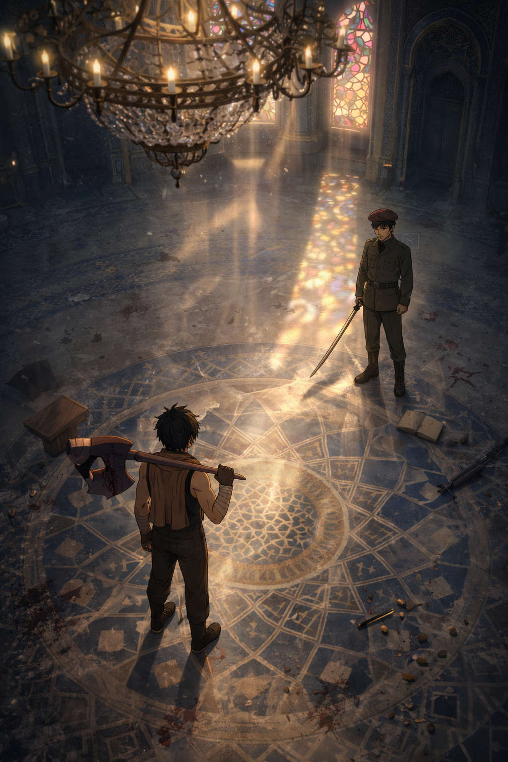 斧と刀、構えた二人の影がステンドグラスの光の中で交差する。