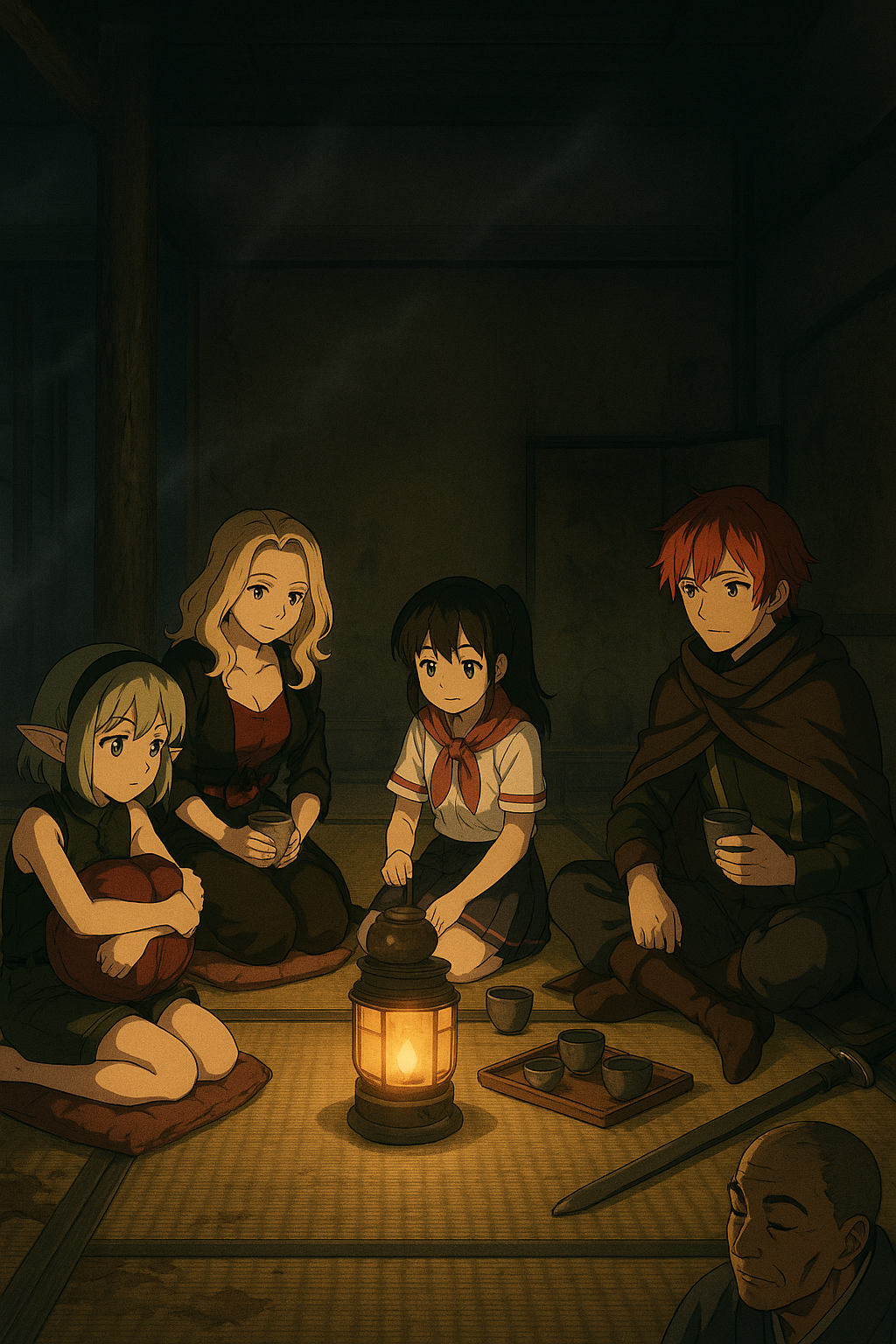 ランタンの灯がゆらめき、茶の湯気が静かに立ち上る。