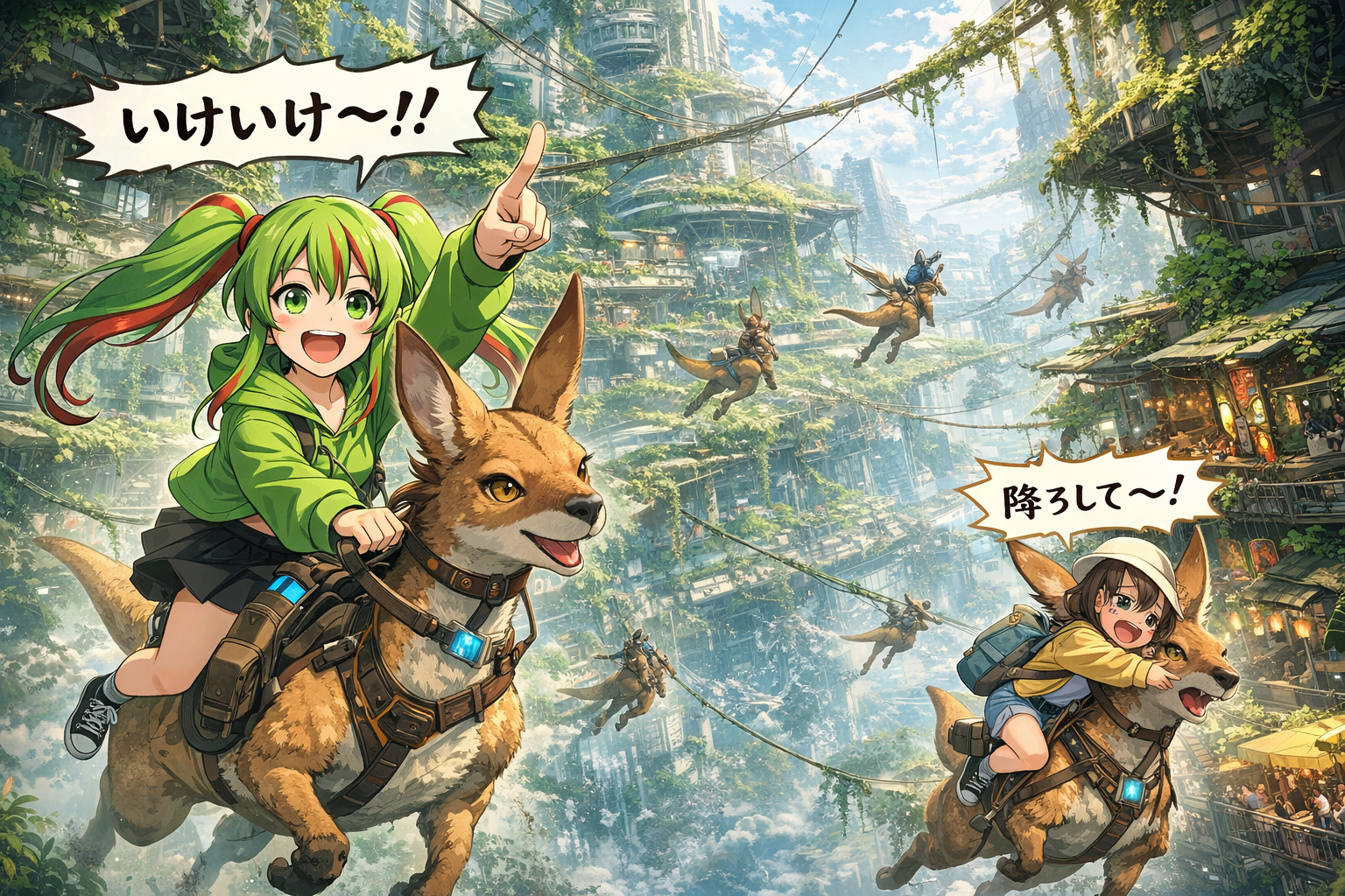 巨大植物と都市が融合し、生活圏が空中へ拡張した立体都市
