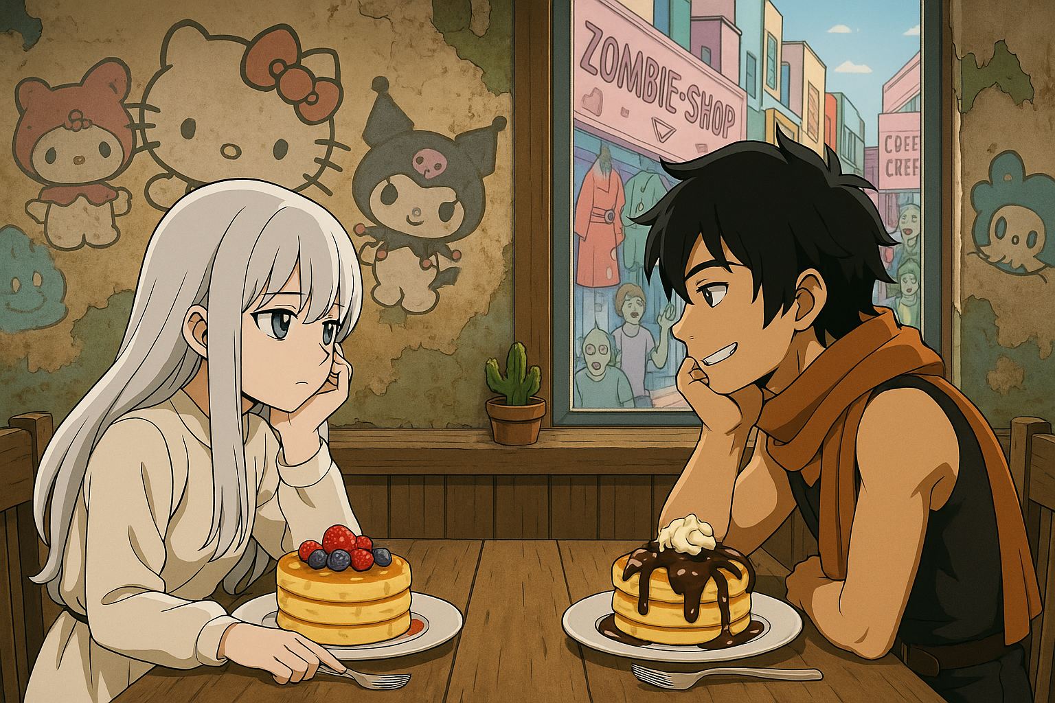 虹色のシロップが滴り、奥ではゾンビの店員がピースをしながら焼いている。