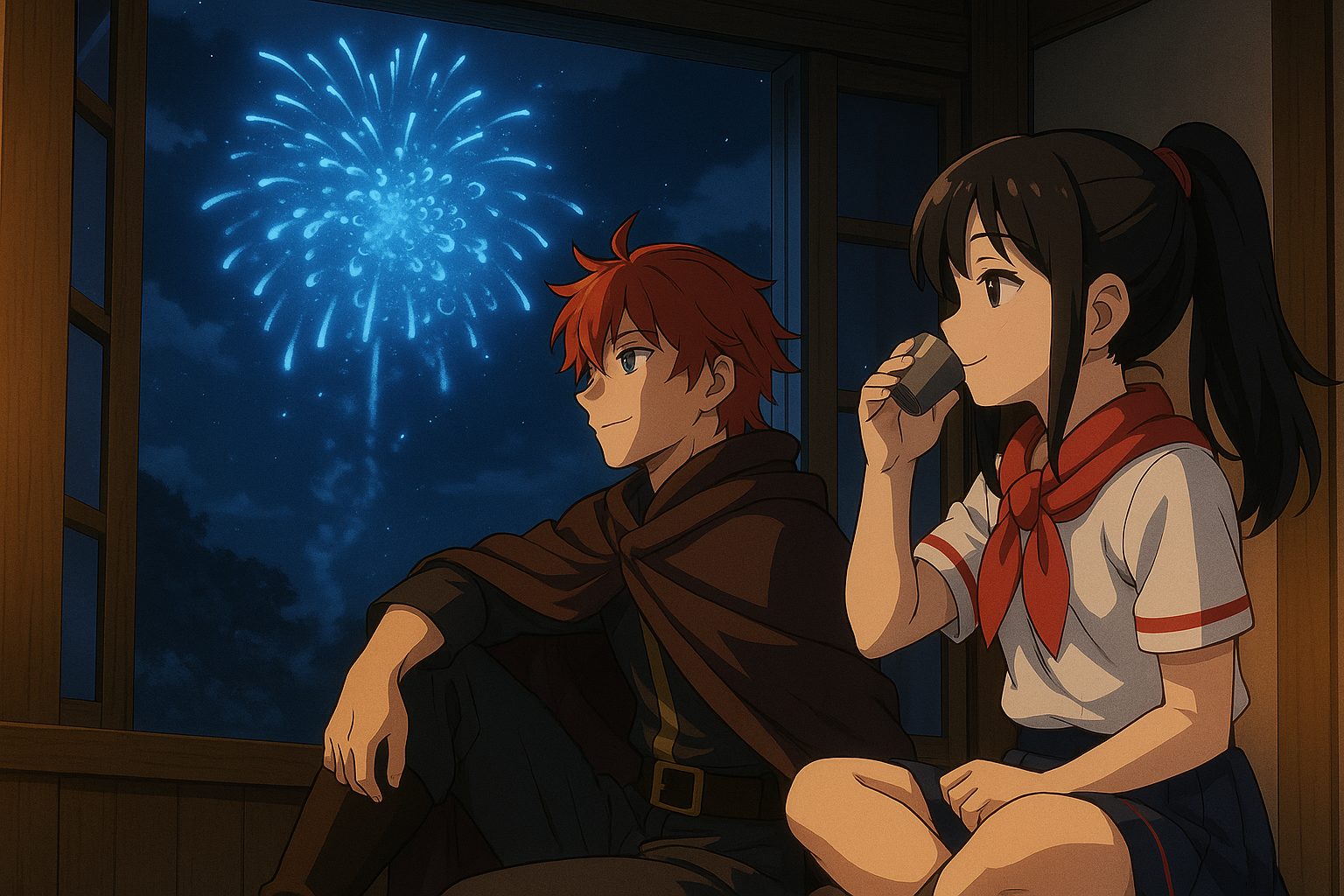ハオもそんな時間かと窓を見やると、王宮から花火が打ち上げられているのが見えた。