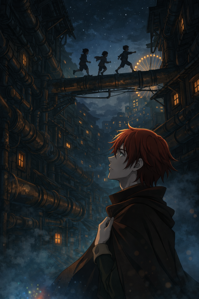 いびつに並んだ屋根の下、継ぎはぎの明かりが夜を縫う。