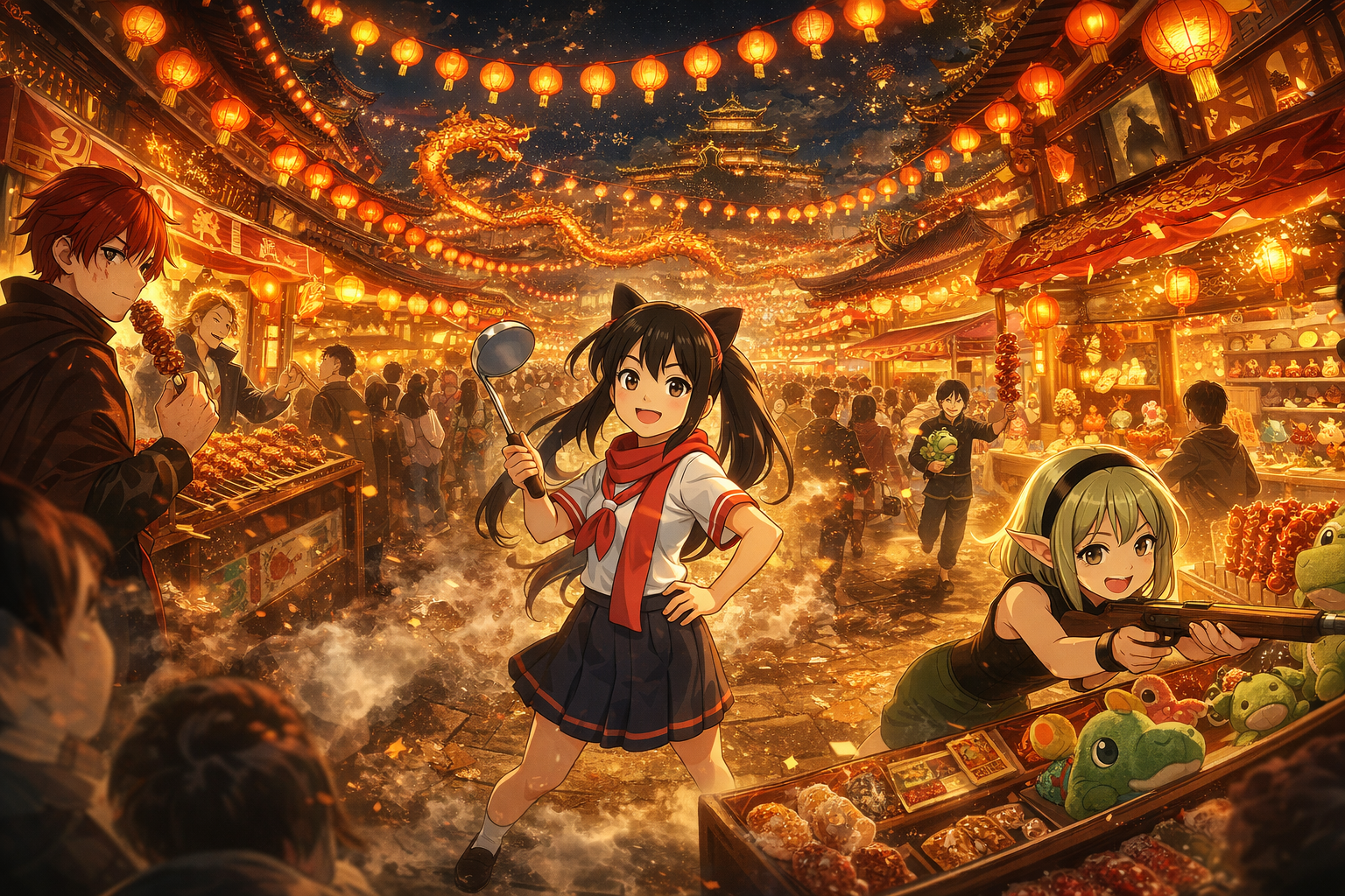 空には龍の紙飾りが舞い、炎でもなく星でもない、柔らかな灯りが夜空に線を引いていた。