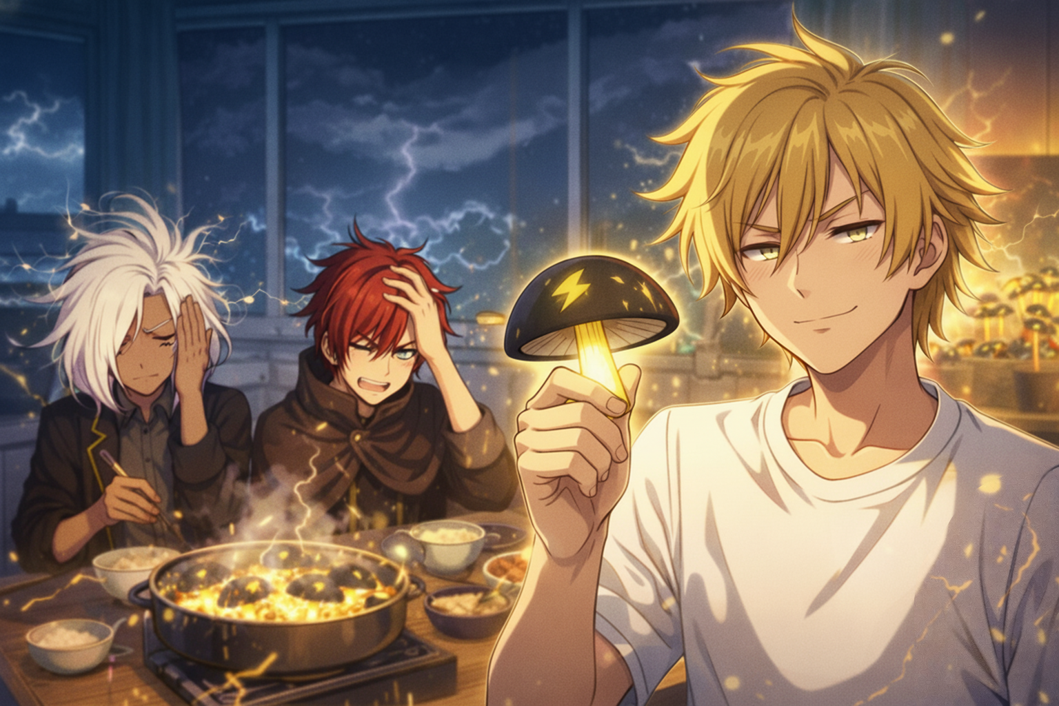テーブルの上では、「雷茸と電撃豆腐のピリ辛鍋」がぐつぐつと煮えていた。