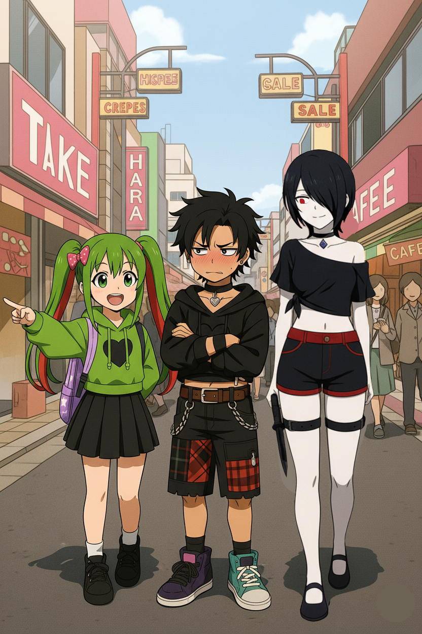 原宿のカラフルな看板の合間を縫って、三人のやり取りは通りのBGMに溶け込んでいく。