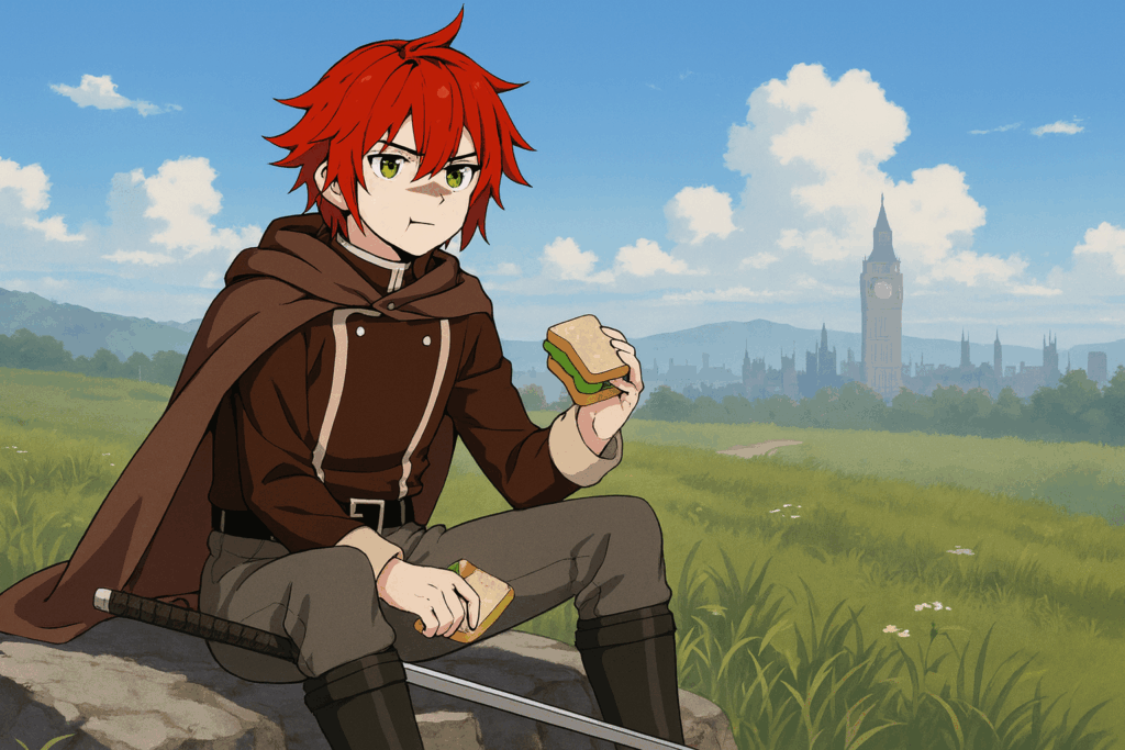 丘の上で、英国風の街並みラピアを眺めながらサンドイッチをかじるガイウス。