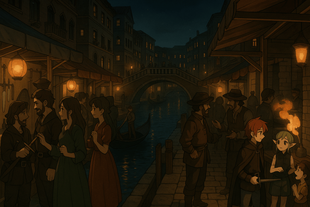 夜が落ちると、クードスの水路沿いには提灯が灯り、石畳に暖かな光が滲んでいた。