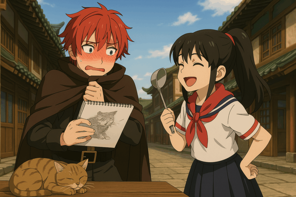 フーロン地方、宿場町ホアリン。軒先に干された布が風に揺れ、唐辛子と油の香りが漂う昼下がりの通りで、ひとりの青年がベンチに腰を下ろしていた。顔に傷、眼光鋭く、何かを睨むような目つき。だがその視線の先にあるのは、魔物でも敵兵でもなく、ただの猫である。