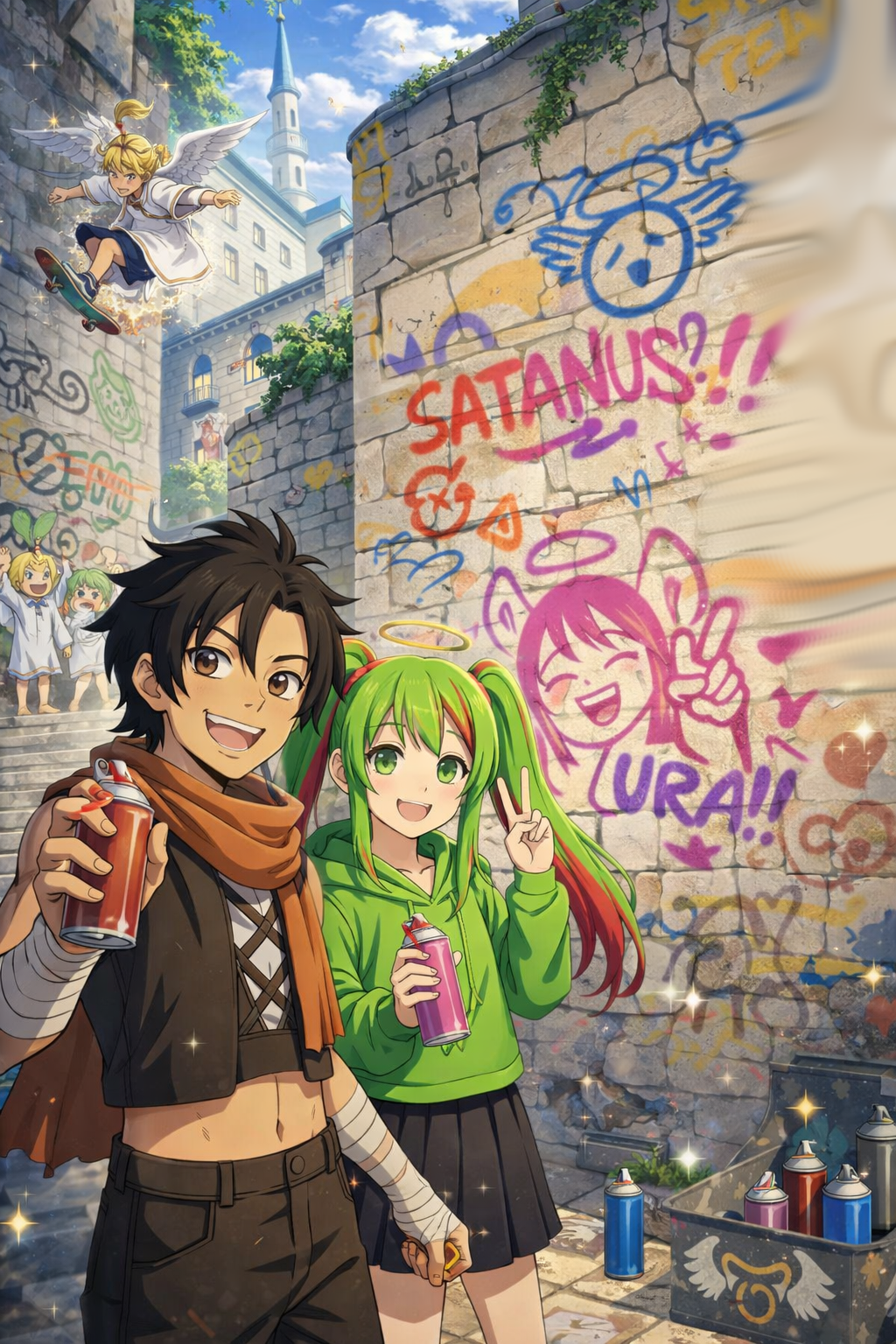 伝統的な天使装飾と、地上発の“CHAOS”系グラフィティが共存