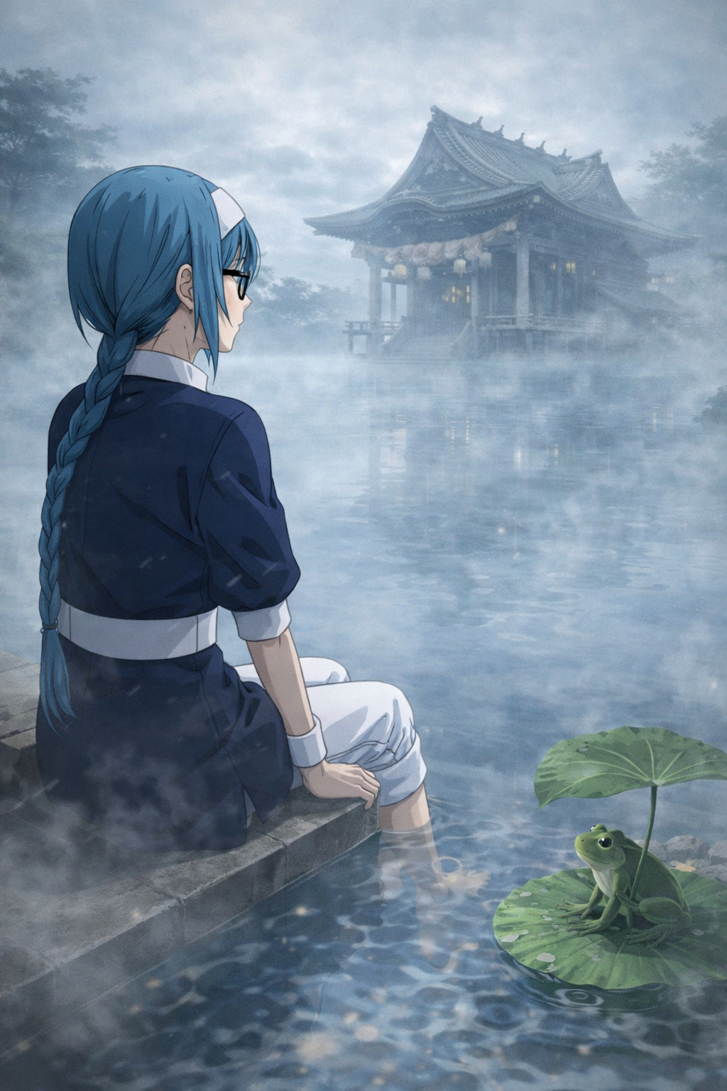 湯気で視界が消え、温泉は生命維持装置