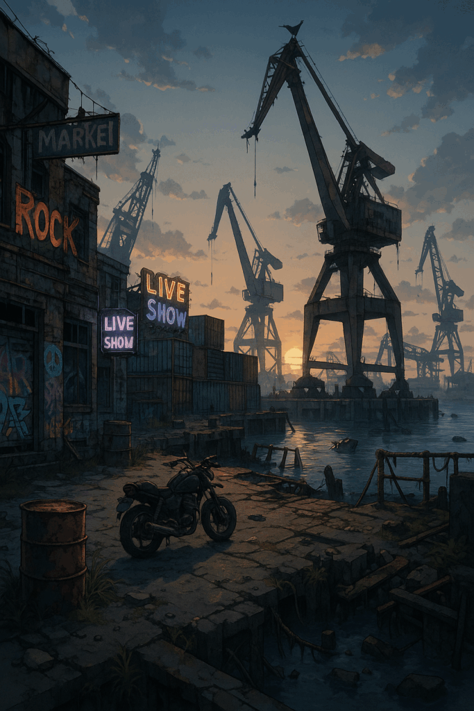 街の象徴は赤錆びたコンテナ街と海に浮かぶライブハウス「ベイ・ノイズ」。