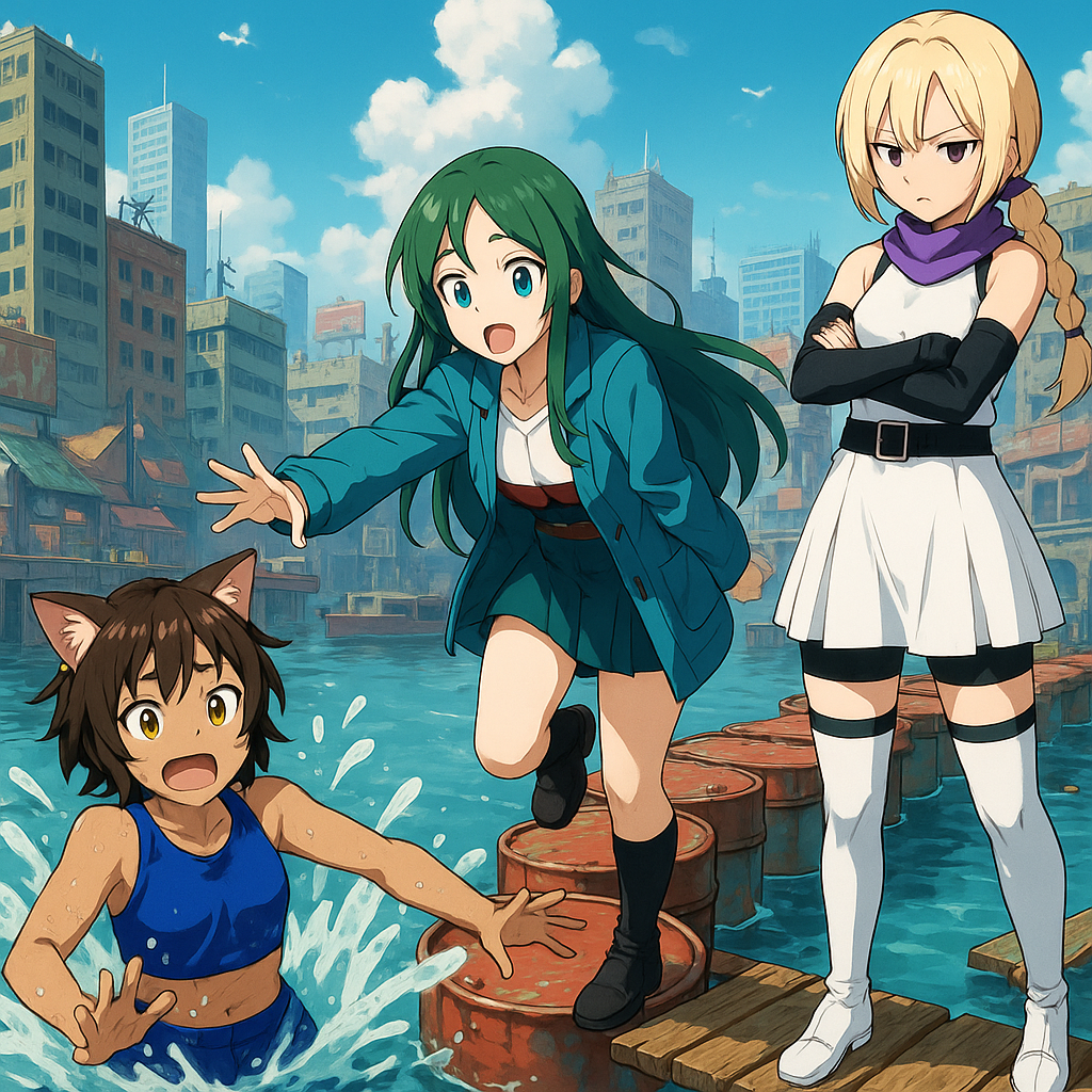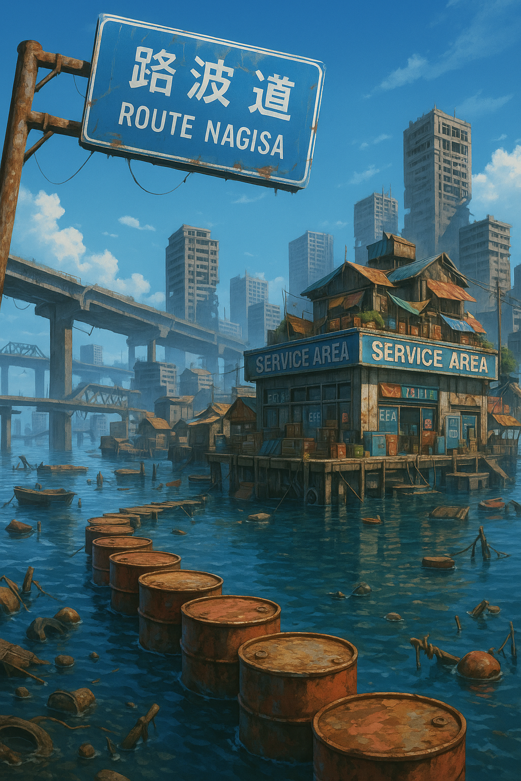 海に沈んだ沿岸都市の高層部や高速道SA跡が浮き島化して残った海上スラムシティ。